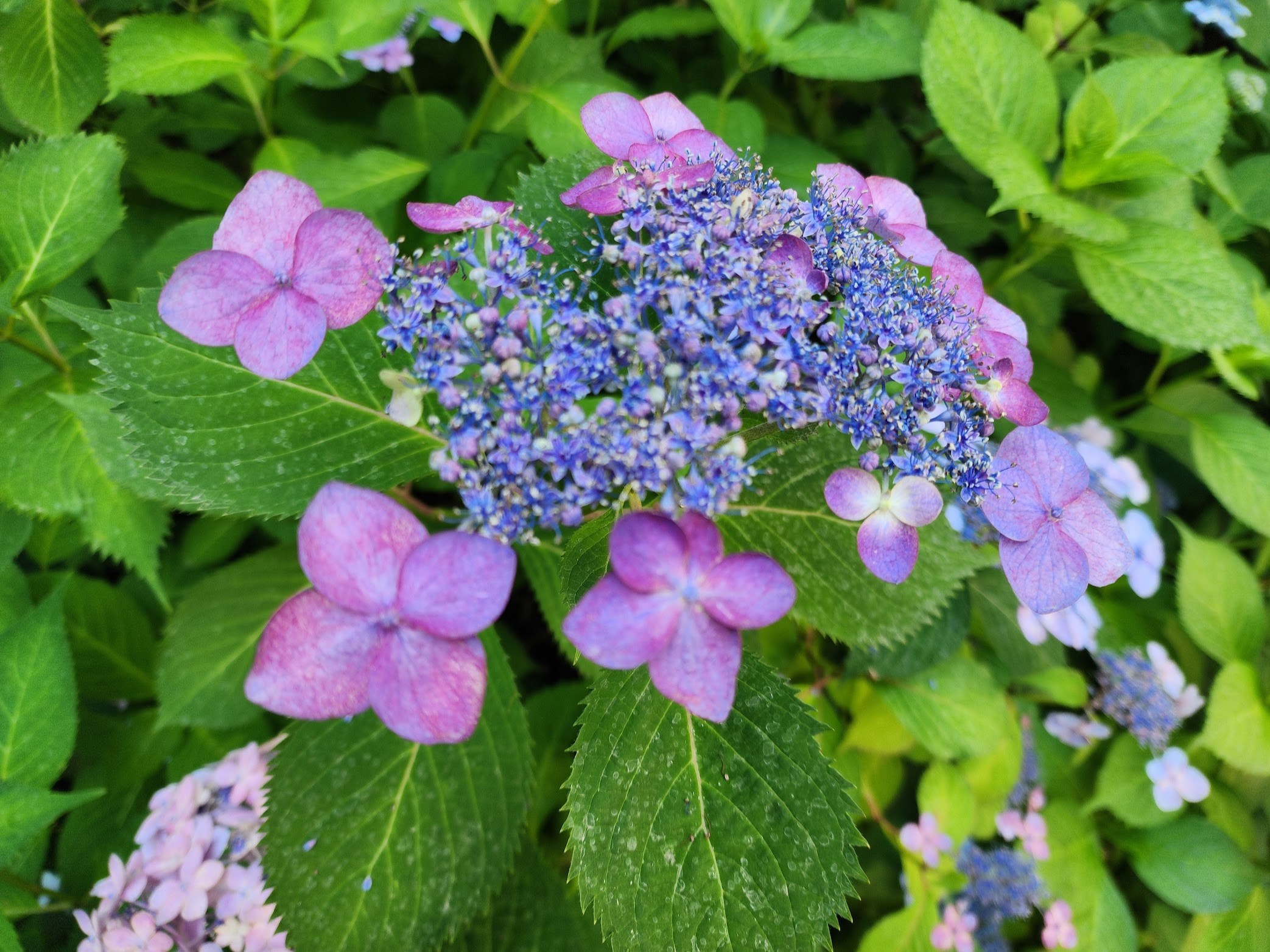 수국 한 그루에서 파란색과 분홍색이 함께 보일 때가 있습니다. 이는 뿌리가 닿은 토양의 성질이 다르기 때문입니다. 만약 뿌리가 뻗어나간 방향마다 산성도(pH)가 다르다면, 한쪽에서는 파란색, 다른 한쪽에서는 분홍색 꽃이 피게 됩니다.
