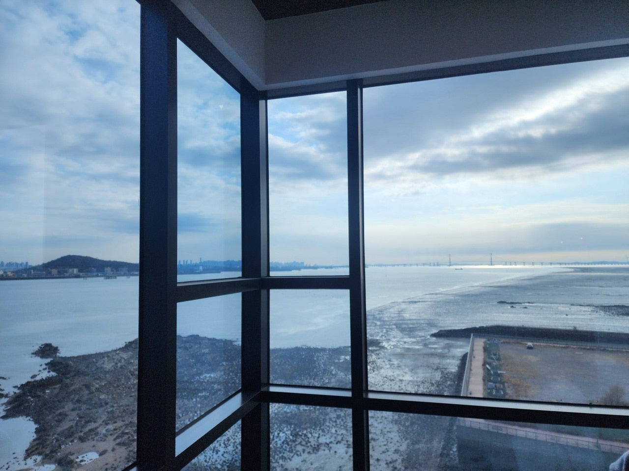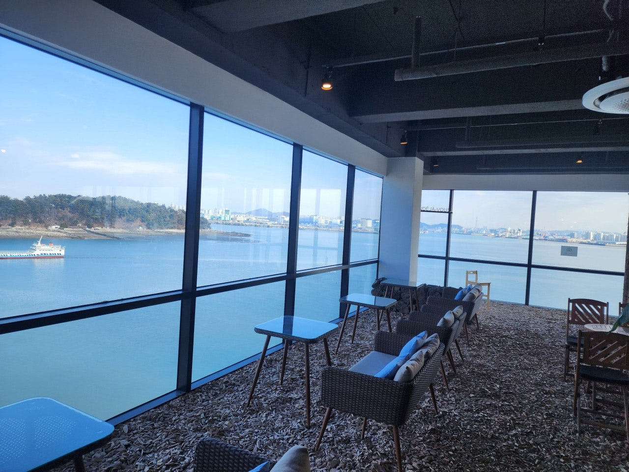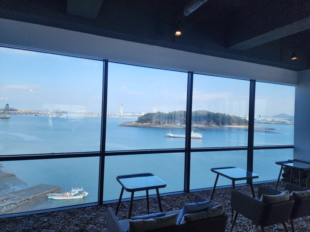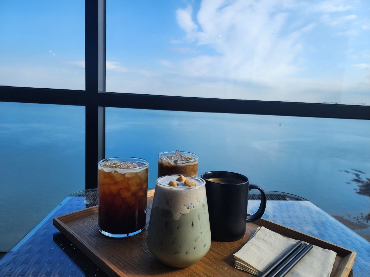 랑데자뷰의 또 다른 매력은 바로 파노라마처럼 펼쳐진 바다 전망입니다. 카페는 오션뷰 건물의 최상층에 위치해 있어 인천대교와 영종대교를 동시에 조망할 수 있습니다. 넓고 깨끗한 창문을 통해 들어오는 자연광과 함께 바다를 감상하며 시간을 보내는 것은 일상에서 쉽게 경험할 수 없는 특별한 순간을 제공합니다. 특히 창가 좌석은 많은 방문객들에게 인기가 높아 주말이나 공휴일에는 미리 자리를 예약하거나 일찍 방문하는 것이 좋습니다.