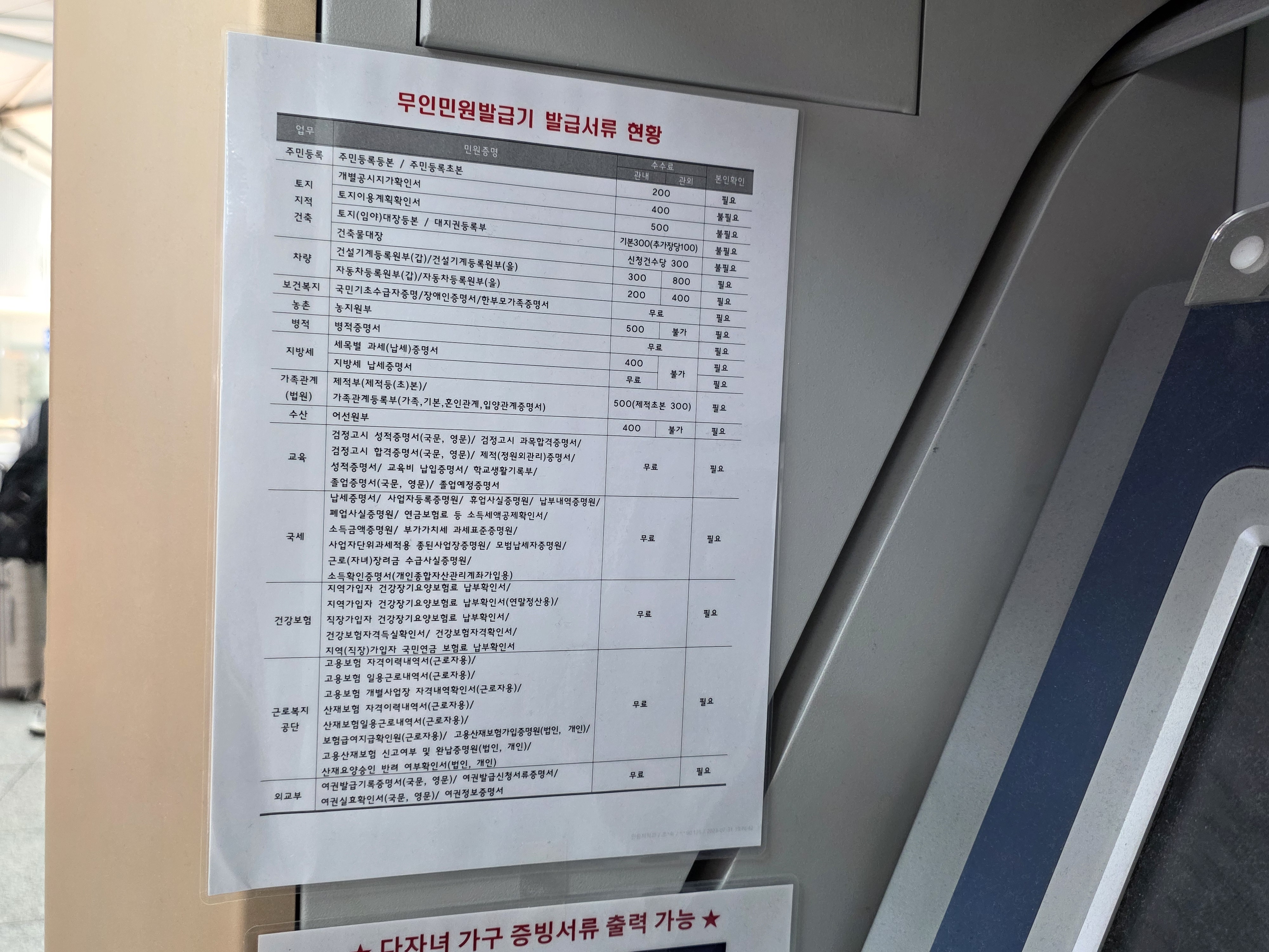 무인민원발급기에서 발급 가능한 대부분의 서류는 유료이며, 일부는 무료입니다. 기기 옆면에 부착된 안내문을 참고하여 정리하면 다음과 같습니다.