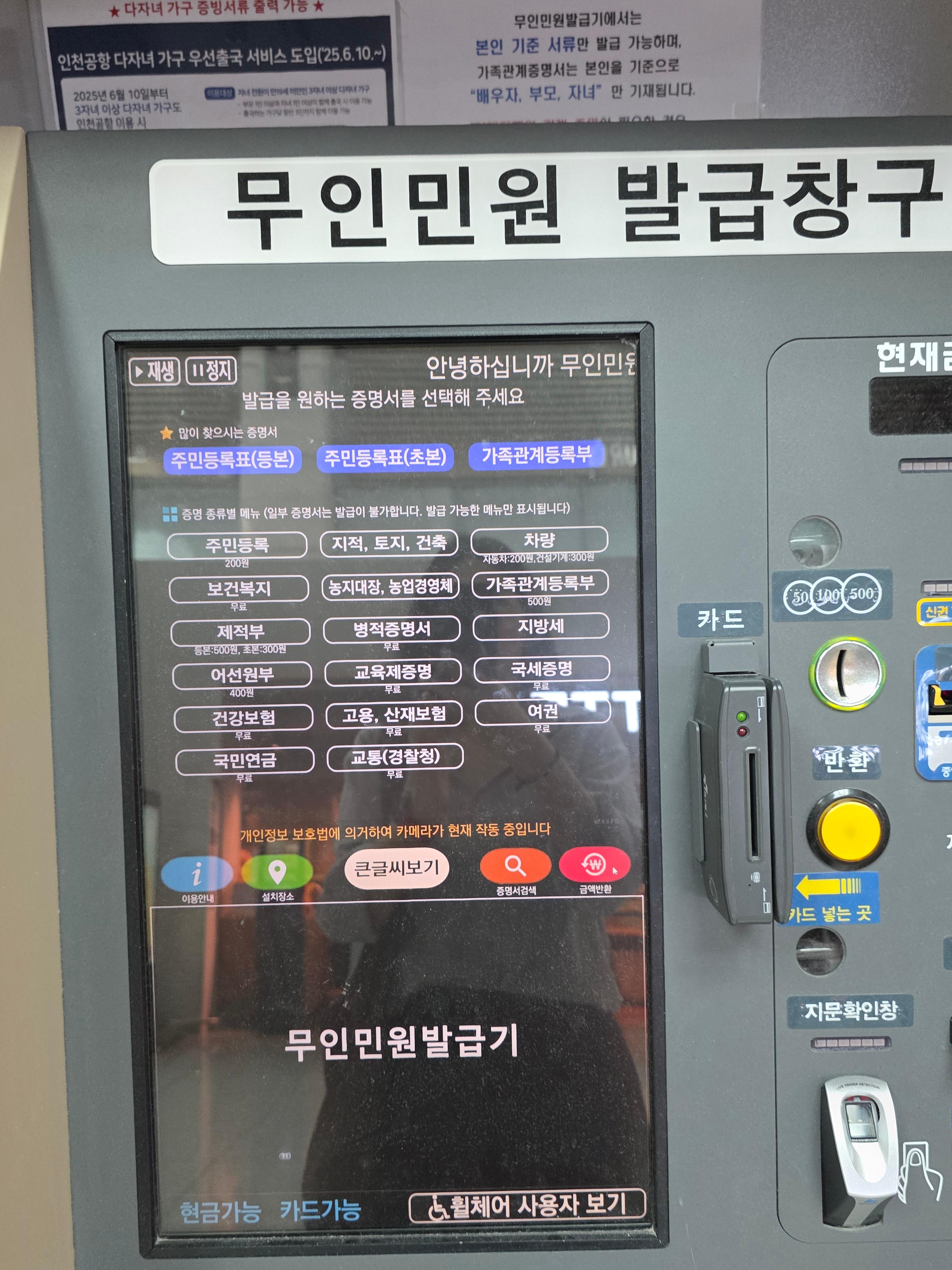 이 글에서는 실제 공항 내 설치된 무인발급기 화면과 안내문을 바탕으로, 위치, 운영시간, 발급 가능한 서류 종류, 수수료, 이용 절차 등을 정확하게 정리해 드리겠습니다.