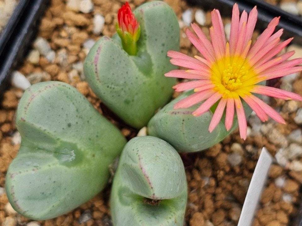 다육식물 중에서도 독특한 형태와 생장 방식으로 많은 사랑을 받는 코노피튬(Conophytum)은 남아프리카의 건조한 지역이 원산지인 식물입니다. 조약돌처럼 매끈한 둥근 잎을 가지고 있으며, 입술 모양의 갈라진 틈 사이에서 꽃을 피우는 것이 특징입니다. 일반적인 다육식물과는 달리, 코노피튬은 가을과 겨울에 성장을 하며 여름에는 휴면기에 들어갑니다.